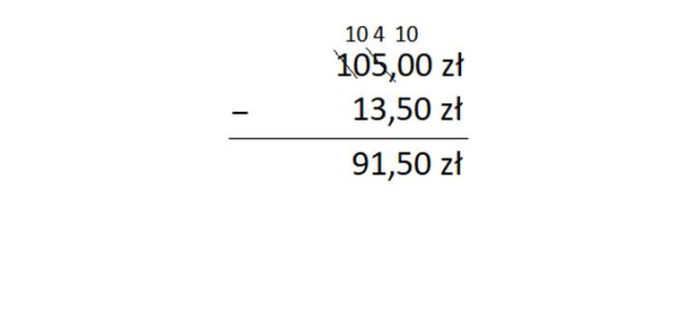 W tym zadaniu musisz obliczyć sposobem pisemnym różnicę liczb 105 zł i 13,50 zł.