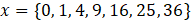 Argumenty są to liczby od 0 do 6 podniesione do kwadratu.