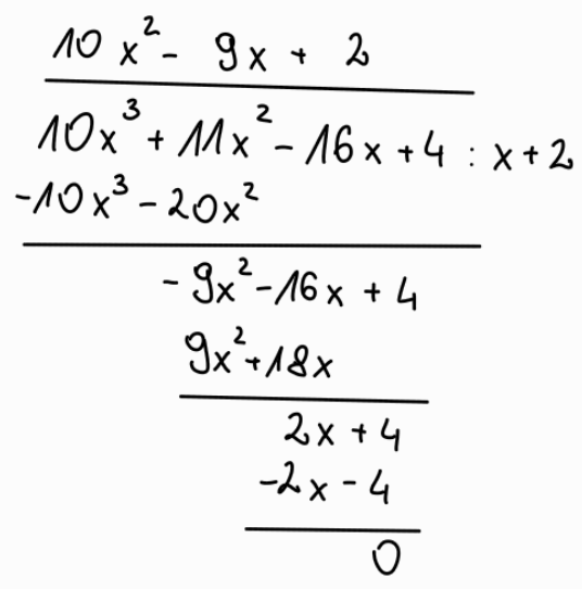 Zgodnie z twierdzeniami o pierwiastkach całkowitych wielomianu sprawdzasz, które liczby są jego pierwiastkami. Po ustaleniu danej liczby wykonujesz dzielenie pisemne wielomianu. Wynikiem dzielenia jest trójmian kwadratowy, który sprowadzasz do najprostszej postaci korzystając z delty, co umożliwi ustalenie wszystkich pierwiastków wielomianu.