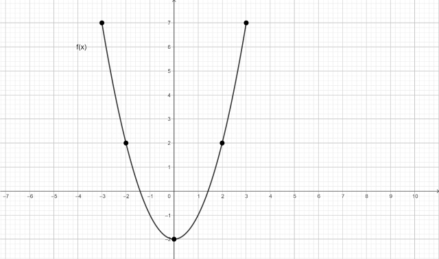 Wykonaj tabelkę, na górze podaj liczbę, którą podstawisz za x, aby wyliczyć y. Dzięki temu wyznaczysz współrzędne punktów, należących do wykresu funkcji. Zaznacz te punkty na wykresie współrzędnych i połącz je ze sobą. Wykres jest ograniczony na przedziale ⟨-3; 3⟩, jako że przedział jest zamknięty, to krawędzie funkcji są zamalowanymi kółkami, ponieważ te punkty należą do wykresu funkcji.