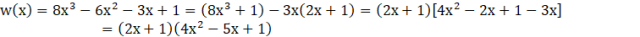 Rozkładamy wielomiany na czynniki korzystając z metody grupowania lub wyliczenia miejsc zerowych funkcji kwadratowej i jej postaci iloczynowej.