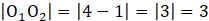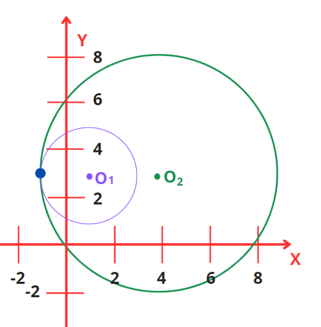 Oznaczamy środki okręgów, odmierzamy ich promienie i rysujemy w układzie współrzędnych. Odległość między środkami okręgów o środkach