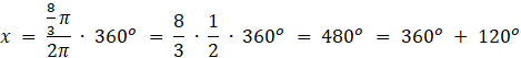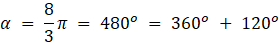 Miarę kąta α zamienisz na stopnie, korzystając z informacji, że 2π radianów to 360o, i układając odpowiednią proporcję: