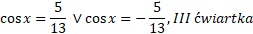 Wyznacz ze wzoru na tangens – sinus lub cosinus. Skorzystaj z jedynki trygonometrycznej. Zauważ, że zarówno sinus, jak i cosinus są ujemne w trzeciej ćwiartce.