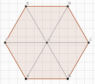 , wiedząc, że punkt O jest środkiem symetrii sześciokąta foremnego.