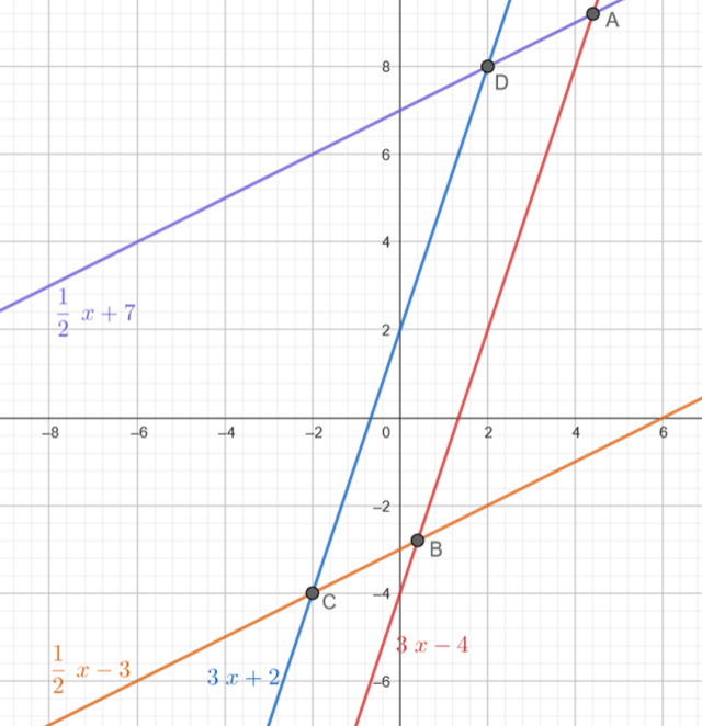 Narysuj proste podane w treści zadania w układzie współrzędnych i zaznacz punkty ich przecięcia, czyli wierzchołki równoległoboku.