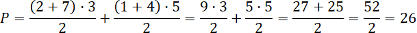 Sześciokąt podzielono na dwa trapezy prostokątne: jeden o podstawach długości 2 i 7 kratek oraz wysokości równej 3 kratki, a drugi o podstawach 1 i 4 kratki oraz wysokości 5 kratek.