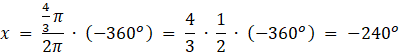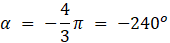 Miarę kąta α zamienisz na stopnie, korzystając z informacji, że -2π radianów to -360o, i układając odpowiednią proporcję: