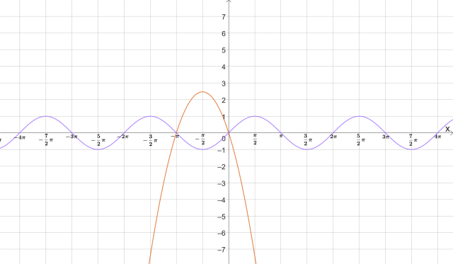 Mając dane wykresy f(x) = sin x i g(x) = -x (x + π), narysuj je w tym samym układzie współrzędnych i wypisz punkty, w których f(x) = g(x).