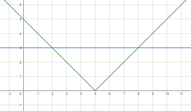 Aby rozwiązać równanie graficznie, naszkicuj wykresy funkcji reprezentujące obie strony równania tzn. y = |-x + 5| oraz y = 3. Rozwiązaniami równania są argumenty, dla których wykresy się przecinają.