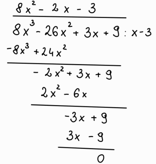 Zgodnie z twierdzeniami o pierwiastkach całkowitych wielomianu sprawdzasz, które liczby są jego pierwiastkami. Po ustaleniu danej liczby wykonujesz dzielenie pisemne wielomianu. Wynikiem dzielenia jest trójmian kwadratowy, który sprowadzasz do najprostszej postaci korzystając z delty, co umożliwi ustalenie wszystkich pierwiastków wielomianu.