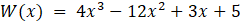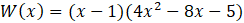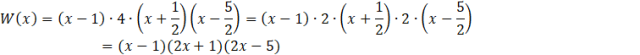 Zauważ, że wielomian W(x) przyjmuje wartość 0 dla x = 1. Oznacza to, że wielomian jest podzielny przez dwumian x – 1. Wykonaj dzielenie za pomocą schematu Hornera, a następnie zapisz wielomian w formie iloczynu. Trójmian 4x2– 8x - 5 rozłóż na czynniki przez obliczenie jego wyróżnika oraz znalezienie pierwiastków. Następnie uprość otrzymany wielomian.