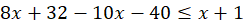 Uprość wyrażenie po prawej i lewej stronie nierówności – wymnóż wszystkie nawiasy, dodaj wszystkie wyrażenia z x oraz wyrazy wolne. Następnie przenieś wszystkie wyrażenia z x na lewą stronę, a wyrazy wolne na prawo. Podziel odpowiednio nierówność stronami. Zapisz rozwiązanie jako przedział.