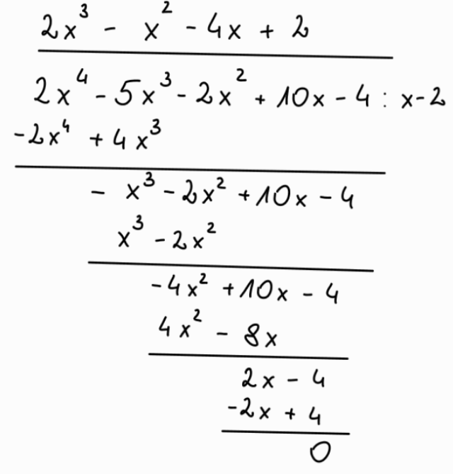 Zgodnie z twierdzeniami o pierwiastkach całkowitych wielomianu sprawdzasz, które liczby są jego pierwiastkami. Po ustaleniu danej liczby wykonujesz dzielenie pisemne wielomianu. Wynikiem dzielenia jest wielomian stopnia trzeciego, który sprowadzasz do najprostszej postaci, co umożliwi ustalenie wszystkich pierwiastków wielomianu.