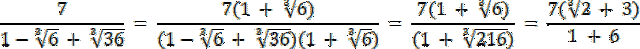 W tym zadaniu wymnóż mianownik przez taką liczbę, aby wynik jego iloczynu był liczbą wymierną. Skorzystaj ze wzorów skróconego mnożenia dla trzeciego stopnia.