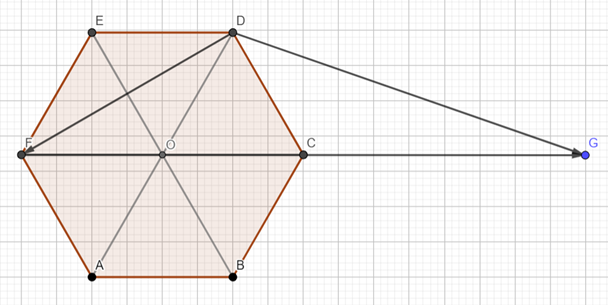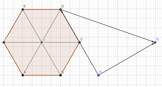 , wiedząc, że punkt O jest środkiem symetrii sześciokąta foremnego.