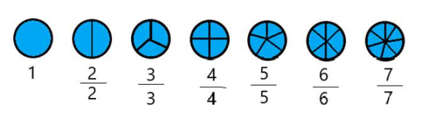 Dokończ rysunki i podpisz je ułamkami według wzoru i zapisz różne ułamki równe 1.