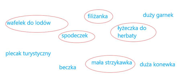 Otocz linią nazwy przedmiotów, które mają pojemność mniejszą niż 1 l.