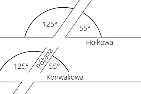 W tym zadaniu zmierz, pod jakim kątem ulica Różana przecina ulicę Fiołkową i Konwaliową. Odczytaj 2 możliwe rozwiązania.