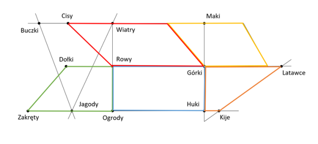 Wybierz dowolne odcinki, które tworzą czworokąt. Każdy ze znalezionych czworokątów zaznacz innym kolorem.