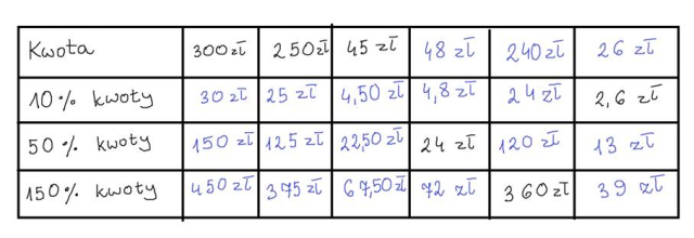 Oblicz kolejne kwoty w tabelce. Zamień procent na ułamek (możesz podzielić dane procenty przez 100% lub od razu zapisać odpowiedź). Następnie pomnóż ten ułamek przez kwotę w górnym wierszu tabelki. Wykonaj obliczenia w ten sam sposób dla każdej wartości.