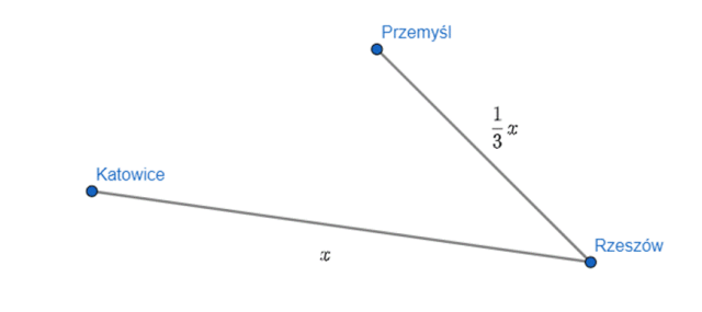 Za niewiadomą przyjmijmy sobie wartość, jaką zapytano w treści, czyli odległość między Rzeszowem a Katowicami. Wiemy, że odcinek z Przemyśla do Rzeszowa jest 3 razy mniejszy, a więc możemy go zapisać jako