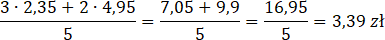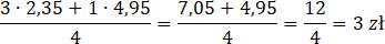 Oblicz średnią cenę jednej butelki wiedząc, że Michał zakupił 3 butelki zwykłej wody za 2,35 zł za jedną butelkę oraz 1 butelkę wody leczniczej za 4,95 zł. Oblicz, jak zmieni się średnia, jeżeli Michał zakupi 2 butelki wody leczniczej zamiast 1.