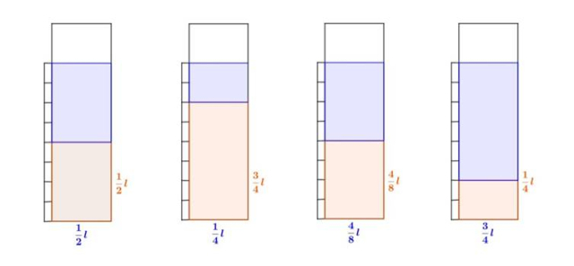 W każdym naczyniu pokoloruj ilość soku wlanego do naczynia oraz ilość soku, jaką należy jeszcze wlać, wiedząc, że obok naczynia podana jest ilość już nalanego soku, a w całym naczyniu ma być 1 litr.