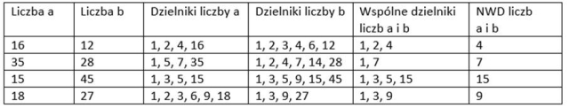 Wpisz do tabeli dzielniki liczby a i dzielniki liczby b, ich wspólne dzielniki i największy wspólny dzielnik.