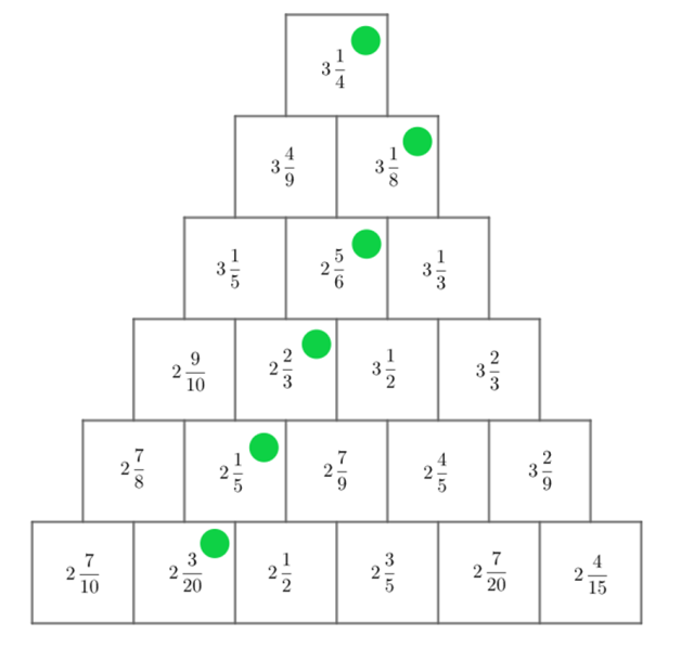 Pokoloruj kwadraty zaznaczone zieloną kropką. Większy jest ułamek, który przy takim samym mianowniku ma większy licznik, a w przypadku, gdy liczniki są równe to przy mniejszym mianowniku. To samo zachodzi dla liczb mieszanych, jeśli liczba całkowita jest różna to wtedy tylko ona ma znaczenie.