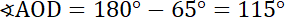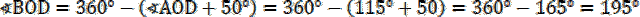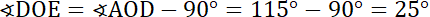Zwróć uwagę na zaznaczone łuki – te kąty należy obliczyć. Kąt AOD to różnica miary kąta AOC, czyli 180 stopni i kąta 65 stopni. Miarę kąta BOD poznasz, gdy od kąta pełnego, czyli 360 stopni odejmiesz kąt AOD i 50 stopni. Kąt DOE to różnica miary kąta AOD i kąta prostego, czyli 90 stopni.