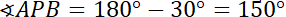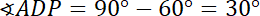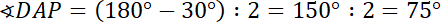 Zauważ, powstałe trójkąty są równoramienne. Kąt przy wierzchołku D to różnica miar kąta prostego i kąta 60 stopni. Kąt przy podstawie otrzymasz, odejmując od 180 stopni miarę kąta ADP, a wynik dzieląc przez 2. Kąt PAB to różnica kąta prostego i kąta DAP, taką samą miarę ma kąt ABP. Miarę kąta rozwartego poznasz, odejmując od 180 stopni miary dwóch kątów ostrych w tym trójkącie.