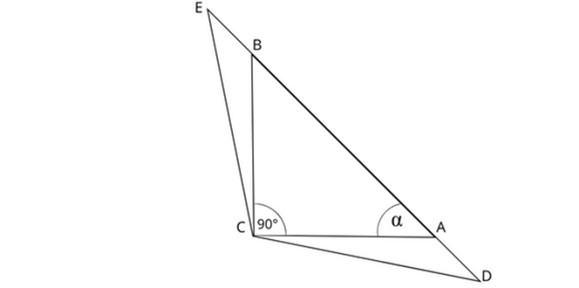 W tym zadaniu udowodnij, że kąt DCE = 135°, jeśli w trójkącie prostokątnym ABC, gdzie kąt ACB = 90° na prostej AB odłożono odcinki AD i BE takie, że AD = AC i BE = BC.