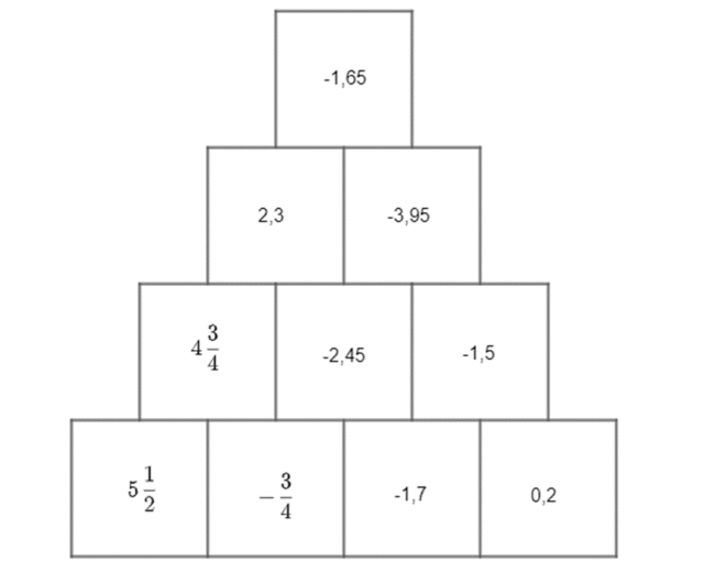 Na początek uzupełnij brakującą liczbę w pierwszym wierszu: po powiększeniu jej o 0,2 powstała liczba (–1,5), więc szukana liczba jest o 0,2 mniejsza od –1,5. Następnie dodawaj do siebie liczby stojące obok siebie, gdy są one różnych znaków porównaj ich wartości bezwzględne i odejmij od większej wartości wartość mniejszą, a przed wynik wstaw znak, który stał przed liczbą o większej wartości bezwzględnej.