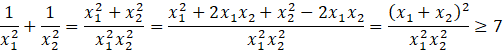 Aby wyznaczyć rozwiązania, których suma kwadratów odwrotności jest nie większa od 7, przekształć wyrażanie opisujące tę sumę do postaci, którą można przedstawić za pomocą wzorów Viète’a.