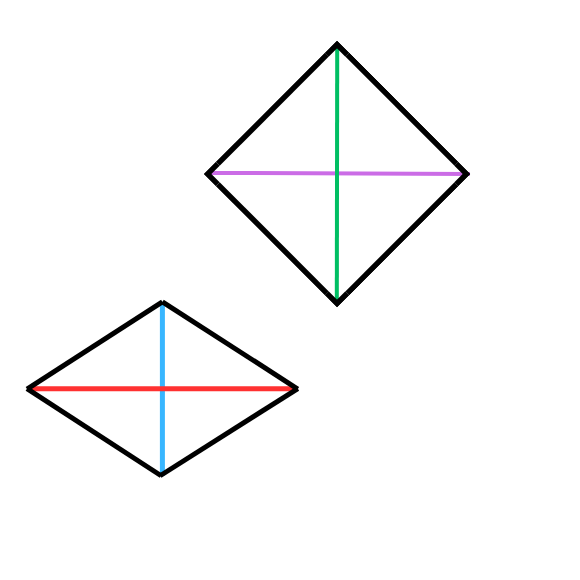 Niebieska przekątna ma długość 3 cm, czyli 6 kratek. Czerwona przekątna ma długość 4 cm, czyli 8 kratek. Zielona przekątna i fioletowa przekątna mają po 6 cm, czyli 12 kratek. Pamiętaj, że przekątne w rombie dzielą się na połowy.