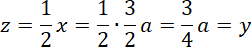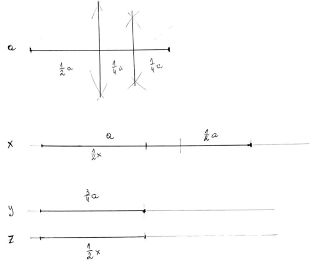 Narysuj dowolny odcinek a i wyznacz jego symetralną, a następnie symetralne odcinków, na które został podzielony odcinek x. Otrzymasz w ten sposób podział na 4 części. Następnie narysuj prostą, na której wyznaczysz odcinki z, y oraz z.