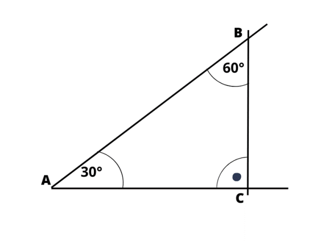 Miary kątów: kąt BAC = 30°, kąt ABC = 60°, kąt ACB = 90°.