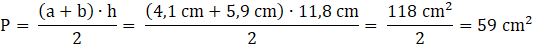 Po policzeniu innych wymiarów trapezu i pomnożeniu wartości pole wynosi 59 cm2.