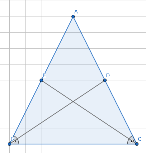 , więc z cechy BKB trójkąty BCE i BCD są przystające, więc środkowe |EC| i |BD| są równe. Co kończy dowód.