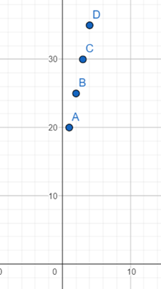 Dziedzina to liczby naturalne dodatnie, więc aby otrzymać wykres podstaw kolejne punkty, zaczynając od 1 i oblicz wartość wykresu, K(1) = 15 + 5 · 1 = 15 + 5 = 20.