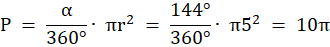 Znając promień r oraz kąt α, oblicz ze wzoru na pole wycinka koła, pole zacieniowanego wycinka.