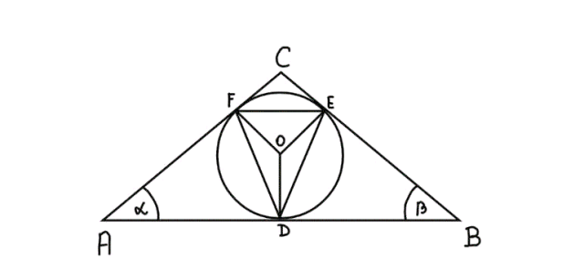 Wiedząc, że trójkąt o α i β opisany jest na okręgu, a kąt γ jest kątem trójkąta, wpisanym w ten okrąg.