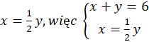 Pierwsze równanie to . Zauważ, że cena jednego kilograma gruszek jest dwa razy większa niż cena jednego kilograma jabłek, czyli: , jeśli podzielisz obie strony równania przez dwa to otrzymasz .