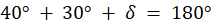 40° + δ + γ to kąty przyległe, a razem tworzą kąt półpełny (180°), a zatem: