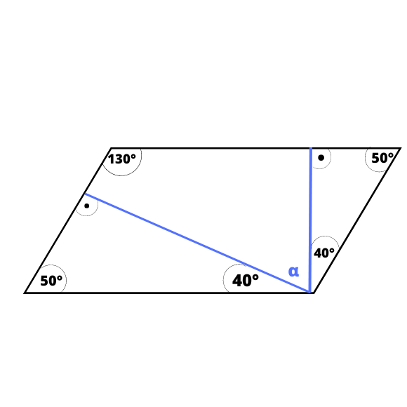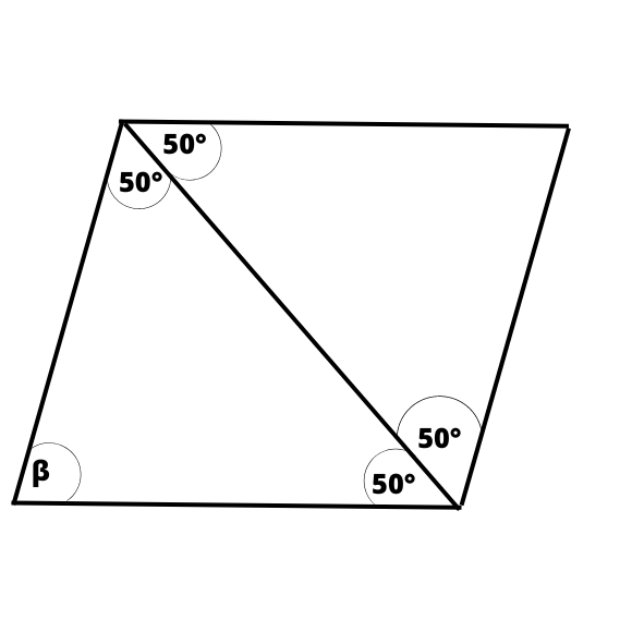 Kąt leżący naprzeciw w równoległoboku ma taką samą miarę, a przekątna przecina kąt na dwie równe połowy, stąd wartość miary jednego z kątów równoległoboku i kąta mu przeciwnego ma 100°.