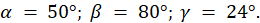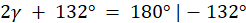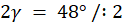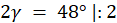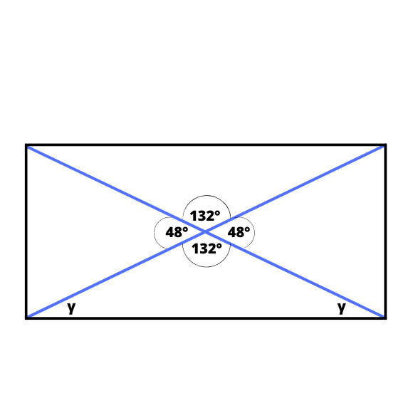 Przekątne prostokąta przecinają się na środku, a kąt przyległy kątowi 48° ma miarę 132° (180° - 48° = 132°). Kąt γ jest jednym z kątów przy podstawie trójkąta równoramiennego. Jako że suma miar kątów w trójkącie jest zawsze równa 180°, to: