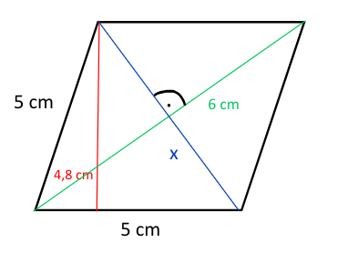 Przekątne rombu przecinają się pod kątem prostym, co oznacza, iż połowa zielonej przekątnej, jest drugą wysokością tegoż trójkąta.