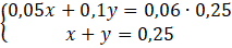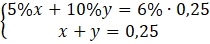Na początku musisz oznaczyć symbolami masy obu roztworów i zamienić masę w gramach na kilogramy. Następnie musisz zapisać pierwsze równanie, w którym suma ilości czystej soli w poszczególnych roztworach jest równa ilości soli w 0,25 kg 6%-roztworu. Drugim równaniem będzie to, że suma mas obu roztworów wynosi 0,25.