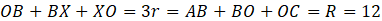 Poprowadź pomocnicze odcinki AB, BO, OC, OX i BX. Zauważ, że kąt